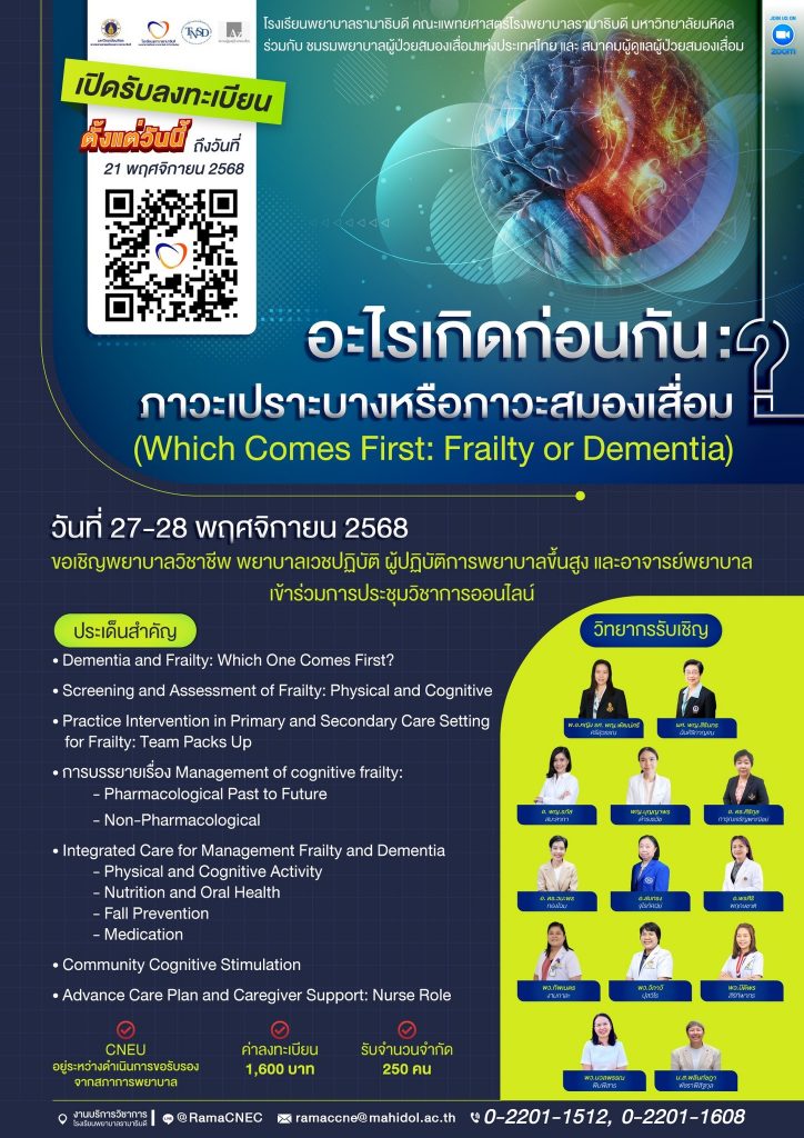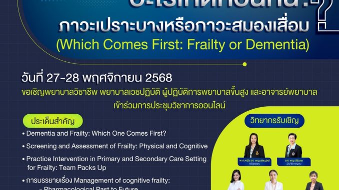 กำหนดการประชุมวิชาการ “อะไรเกิดก่อนกัน: ภาวะเปราะบางหรือภาวะสมองเสื่อม?” (Which comes first: frailty or dementia) วันที่ 27-28 พ.ย. 2568 (online) ชมรมพยาบาลผู้ป่วยสมองเสื่อมแห่งประเทศไทย 26/11/2025 Pitiporn ข่าวประชาสัมพันธ์, งานประชุมวิชาการ 0